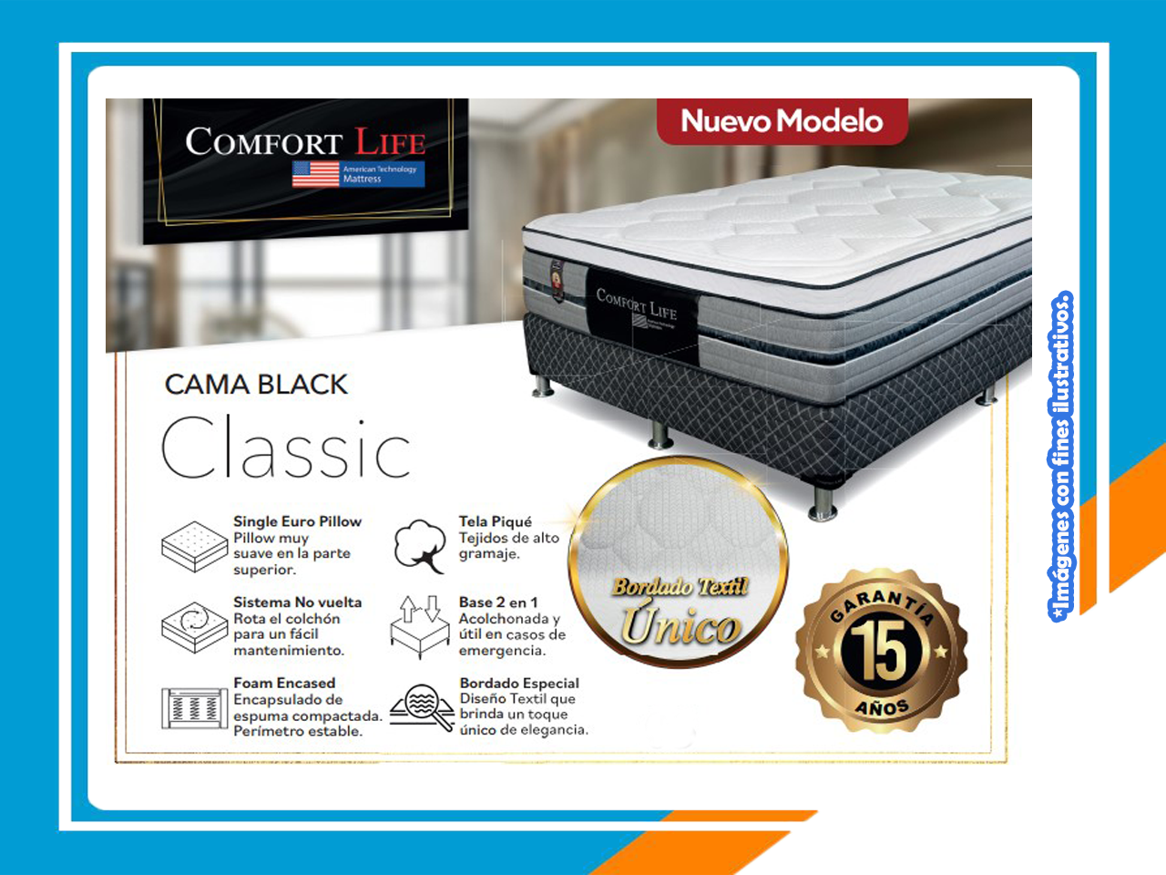 - Descripción: Camas Comfort Life Black Classic, Single Euro Pillow, sistema no vuelta, base 2 en 1, tela piqué, foam encased y bordado especial .