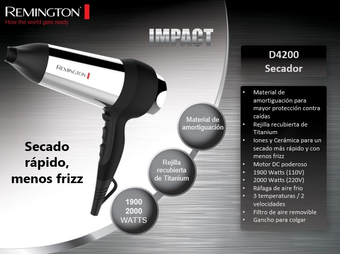 • Descripción: Material de amortiguación para mayor protección contra caídas, Rejilla recubierta de Titanium, Iones y Cerámica para un secado más rápido y con menos frizz, Motor DC poderoso, 1900 Watts (110V), 2000 Watts (220V), Ráfaga de aire frio, 3 temperaturas / 2 velocidades, Filtro de aire removible, Gancho para colgar.