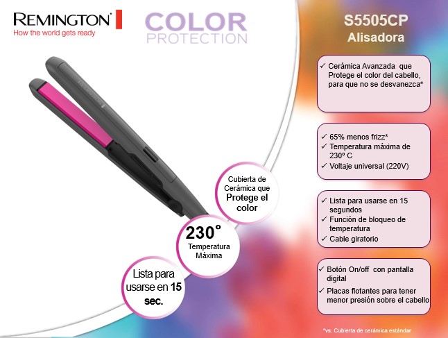 - Descripción: Cerámica Avanzada que Protege el color del cabello, para que no se desvanezca*, 65% menos frizz*, Temperatura máxima de 230º C, Voltaje universal (220V), Lista para usarse en 15 segundos, Función de bloqueo de temperatura, Cable giratorio, Botón On/off con pantalla digital, Placas flotantes para tener menor presión sobre el cabello