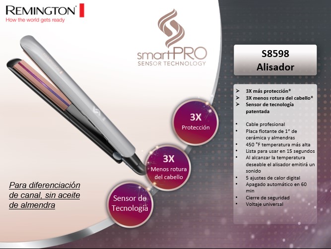 • Descripción: 3X más protección*, 3X menos rotura del cabello*, Sensor de tecnología patentada, Cable profesional, Placa flotante de 1” de cerámica y almendras, 450 °F temperatura más alta, Lista para usar en 15 segundos, Al alcanzar la temperatura deseable el alisador emitirá un sonido, 5 ajustes de calor digital, Apagado automático en 60 min, Cierre de seguridad, Voltaje universal.